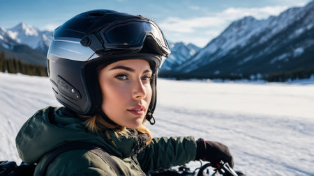 Woman on snowmobile tour stopping to take photo snowy mountain vista look of wonder