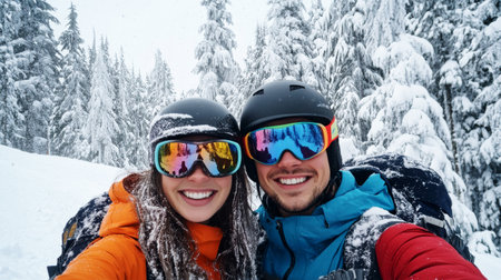 A couple enjoys a fun day skiing in a winter paradise, surrounded by stunning snow-covered trees while taking a cheerful selfie together on the slopes.
