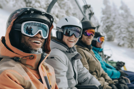 Diverse group of friends smiling and wearing goggles and helmets while enjoying a happy leisure activity on a chairlift in a snowy mountain resort during the cold winter weather