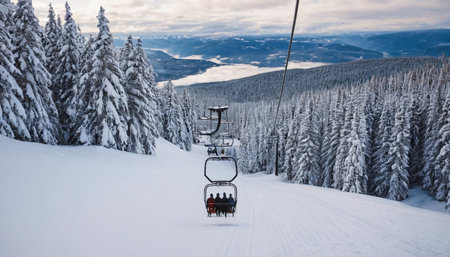 Group of female skiers smiling on a chairlift, surrounded by snow-covered trees and mountains, showcasing the excitement of winter sports and friendship