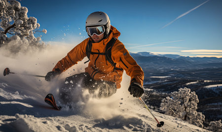 Young athlete freestyle Skier having fun while running downhill in beautiful landscape on sunny day during winter season