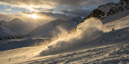 winter sports action shot, with blur of skis and snowboards flying down the slopes, created with generative ai