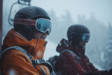 Two skiers are waiting for the ski lift on a snowy mountain