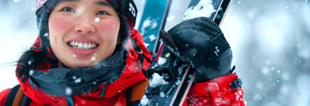 Close-up of a Young Smiling Asian Woman Skier in Jacket with Ski Equipment on a Snowy Day. Concept of Winter Sports, Mountain Adventure, Outdoor Fun. Copy space. Banner.