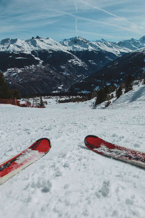 Pov or firts person view of red skis and beautiful mountain range in the background visible on a ski slope in france.
