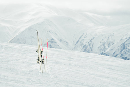 Pair of white skis with poles planted in snow on mountain slope with alpine peaks in background, concept of winter sport, ski holiday, rentals, quality gear and day off from slopes