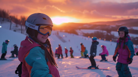 Children Enjoying Snowboarding at Sunset in a Winter Resort Location With Colorful Attire and a Beautiful Mountainous Backdrop. Generative AI