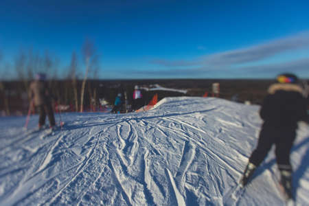 Omsk, Russia - 01 January 2022: Winter holidays rest. Young tourists. Ski resort on a sunny day, extreme recreation, seasonal vacation. Happy skiers, snowboarders and funicular railway. Winter mountains panorama.