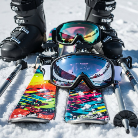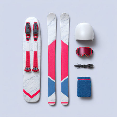 This vibrant arrangement of ski gear features sleek skis, stylish goggles, a protective helmet, and related accessories on a light background. Perfect for winter sports enthusiasts.