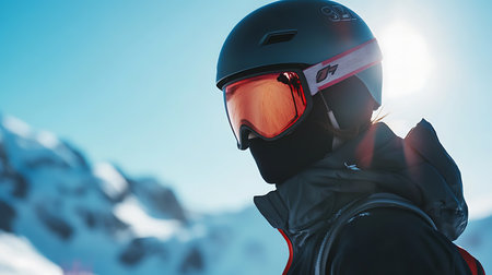 Close up portrait of a skier with ski goggles and a helmet. The person is enjoying a sunny winter day on the snowy slopes.