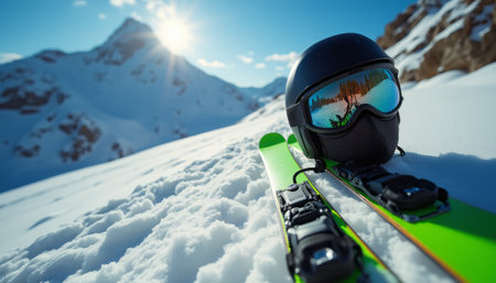 A sleek black ski helmet and vibrant green skis lie on a pristine blanket of snow, glistening under the bright sun. The majestic mountains rise in the background, their peaks kissed by sunlight, creating a breathtaking winter wonderland that invites adventure and exhilaration.