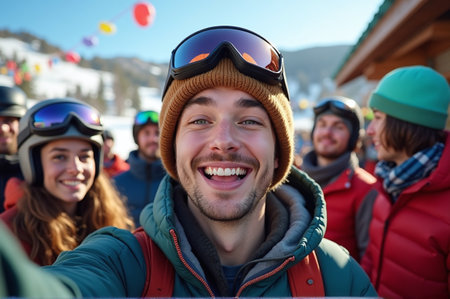 A group of young people bundled in colorful winter clothing poses for a cheerful selfie in a snowy ski resort. Snow covered trees and slopes create a festive atmosphere.