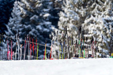 Ruzomberok, Slovakia - December 31, 2025: Ski poles placed in snow near ski slope during winter season at Malino Brdo ski resort, with forest background and active winter tourism.