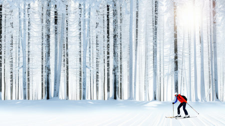 A cross-country skier gracefully moves through a tranquil snowy forest, surrounded by tall trees and bathed in soft sunlight, creating a perfect winter moment.