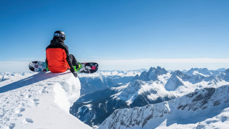 Snowboarding girl sitting on the snow in Innerkrems, Austria, enjoying the view. Lots of snow in the mountains. Endless Alp's chain in front. Winter wonderland, paradise. Perfect condition for skiing.