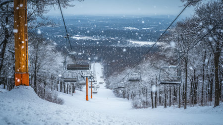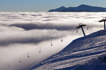 Chairlift or elevated passenger ropeway at ski area. Winter ski resort.