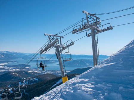 Sandpoint, Idaho/USA - January 2019: Skier Riding Up Chair Lift at Schweitzer Mountain Ski Resort With Lake Pend Orielle View in Background Sunny Winter Day