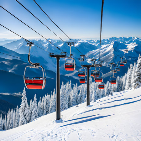 A ski chairlift with a wonderful view of the slopes on a bright winter day.