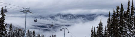 Whistler, British Columbia, Canada - December 26, 2019: Beautiful View of a Gondola with the Canadian Snow Covered Mountain Landscape during a cloudy and foggy winter day.