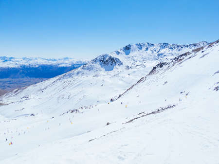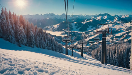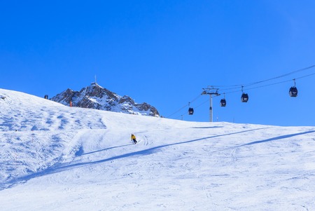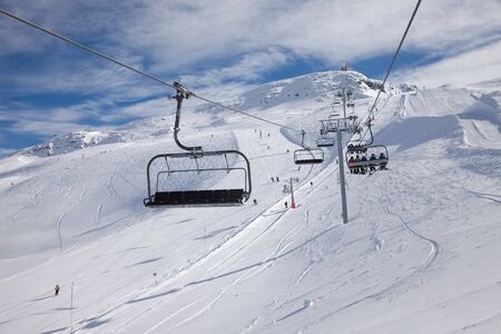 Ski resort. People on ski lift. Snow-capped mountains sunny day. Active winter sport. Ski slope with ski lift and people