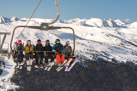 Pas de la Casa, Andorra: January 3, 2021: Young people on a chairlift in the Pyrenees at the Grandvalira ski resort in Andorra in Covid19 time