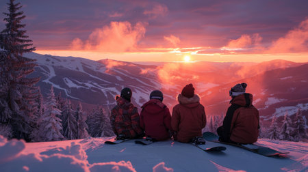 Group of woman skiers and snowboarders on slope in winter ski resort with mountains background