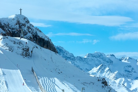 Morning winter Silvretta Alps landscape. Ski resort Silvrettaseilbahn AG Ischgl, Tyrol, Austria. All people are unrecognizable.