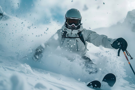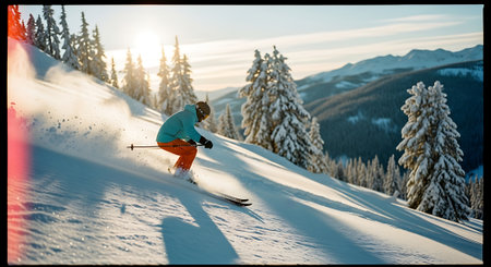 Skier making a fast turn on a snowy slope, sending up a spray of powder snow, with a mountain backdrop and dynamic movement