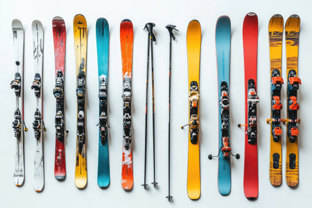 Different pairs of skis and ski poles hanging on a white wall, ready for winter sports enthusiasts
