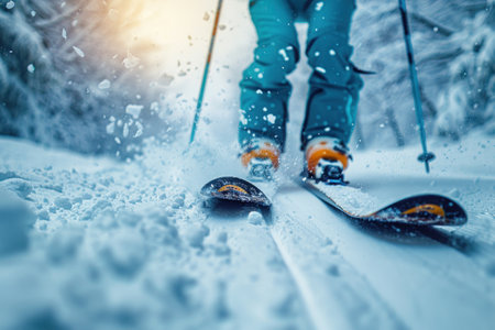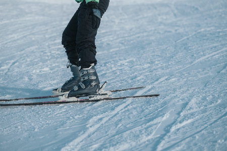 Unrecognizable person practicing skiing on a slope. Mountain and winter sport. Generative AI