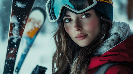 Generative AI Image of Beautiful Female Skier Wear Helmet on Snowy Mountain Hill at Winter Season