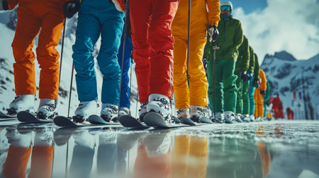 Colorful Line of Skiers Ready for Winter Sports Competition - Celebrating Athleticism.