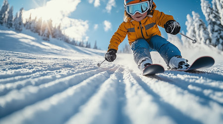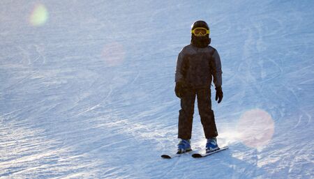 Little boy skiing in the mountains. Winter sport for children. Kids.