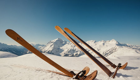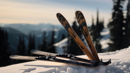 Close-up view of skis resting on fresh snow, blurred mountainous landscape in background, symbolizing winter sports adventure.