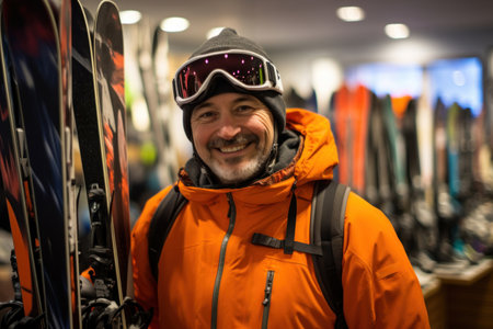 A cheerful man smiles sincerely amid ski gear, creating a welcoming atmosphere in the store
