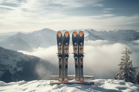 Two skis placed on top of untouched snow, ready for winter sports activities in a cold mountainous setting.