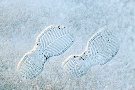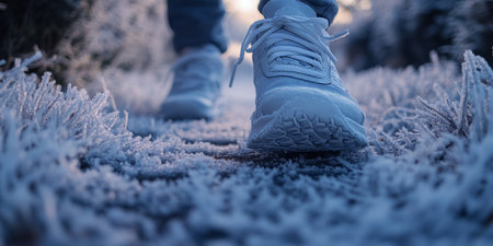 Close Up of Frosty Athletic Running Shoes on Icy Pathway During Winter Walk in Cold Weather