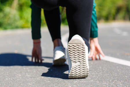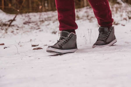 The girl's feet in sneakers are running through the snow. A sports walk alone in nature in winter.
