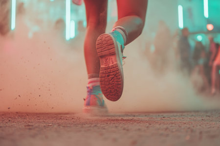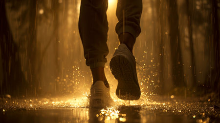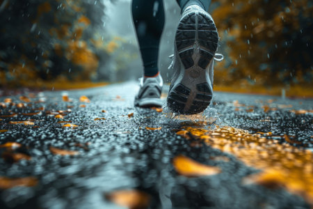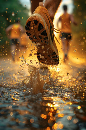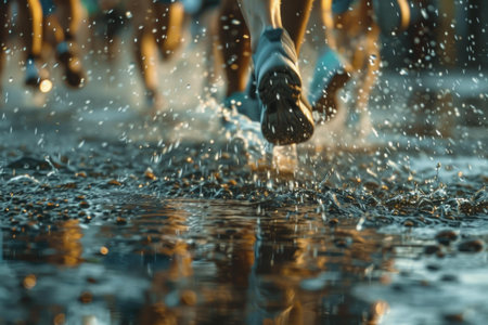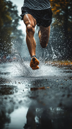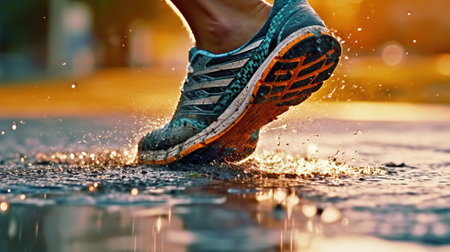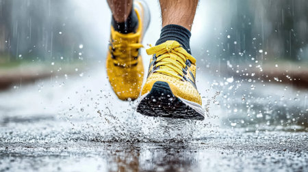 A Running shoes splashing through puddles on rainy day, showcasing energy and motion