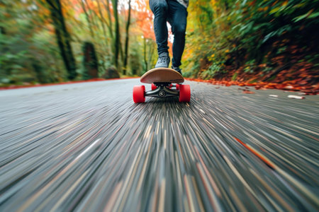Skateboarder is riding down a country road with fall colors blurring in the background