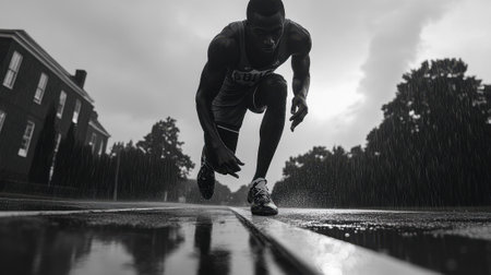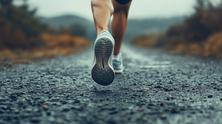 Close-up of a runner jogging in the rain on a road during a marathon, Generative AI