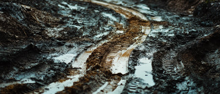 Tire tracks create a winding pattern on a muddy road after rainfall in rural landscape