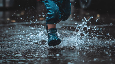 A joyful child jumps in a puddle, creating splashes with their colorful rain boots. The scene captures the essence of childhood fun on a rainy day.