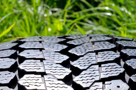 Protector of automobile wheels in the foreground and green grass in the background. Transport and environmental issues