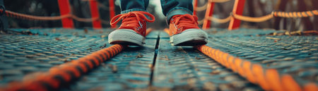 A young person in stylish sneakers leaps high on a metal platform in the urban landscape showcasing dynamic energy in a bustling city.