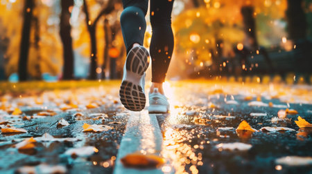 Runners legs in motion, capturing the energy of a marathon on a sun-drenched path covered in fallen leaves.