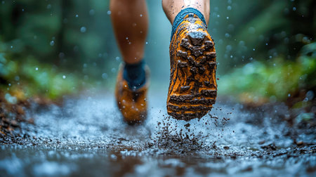 A person running through a muddy trail, the shoes covered in dirt and splashing water. Action-packed and dynamic, representing adventure, endurance, and outdoor activities.