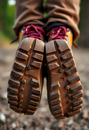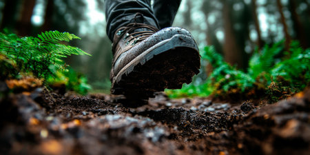 A hiker's boot presses into the damp soil, surrounded by lush greenery. The well-worn footwear shows signs of many adventures taken on tranquil trails.