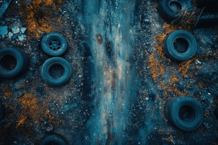 A visually striking image of used tires covered in black tar, highlighting the environmental challenges of waste management and pollution.