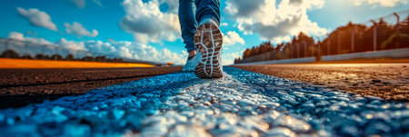 Dynamic Low-Angle View of Runner's Shoes on Athletic Track.